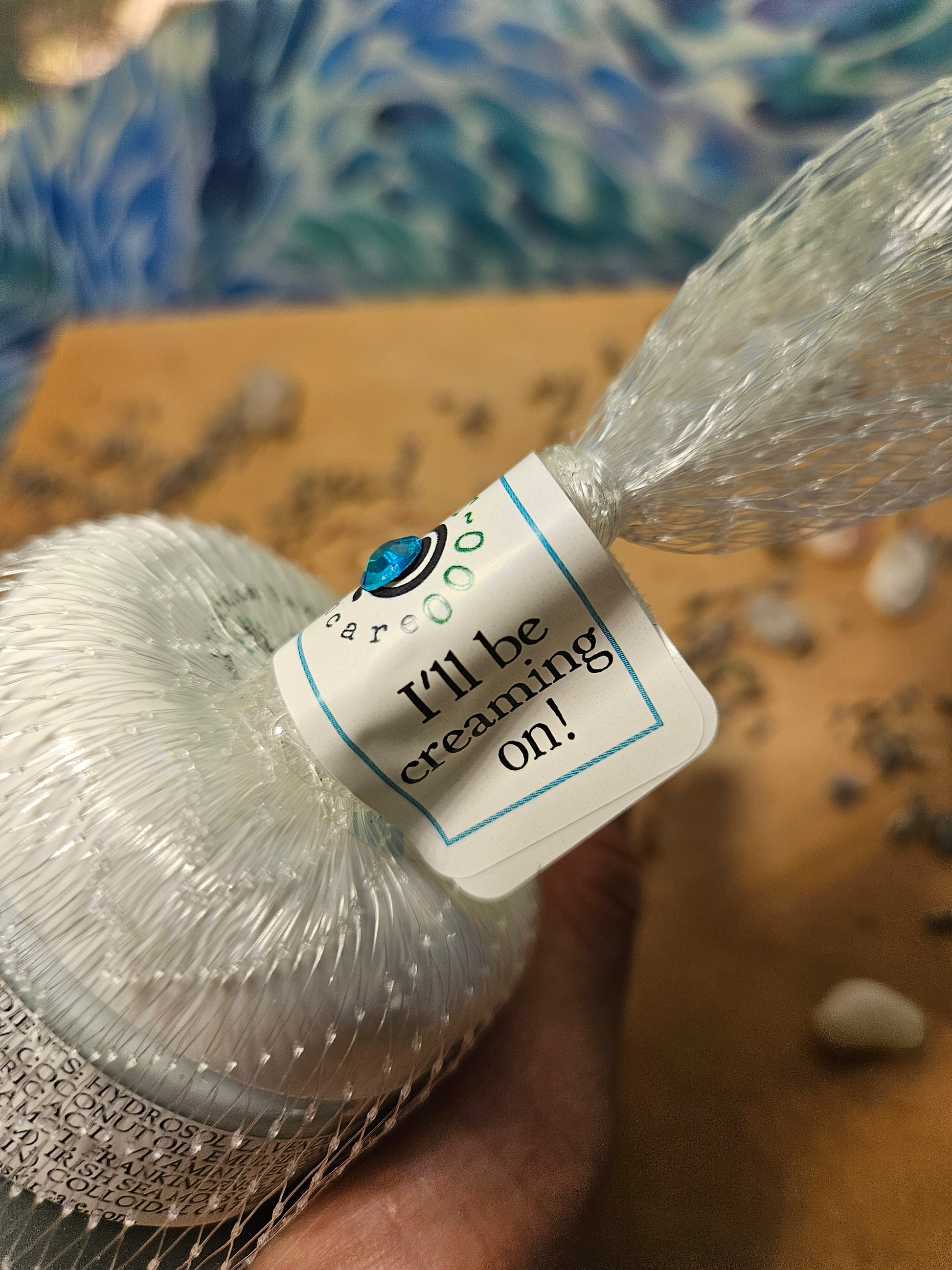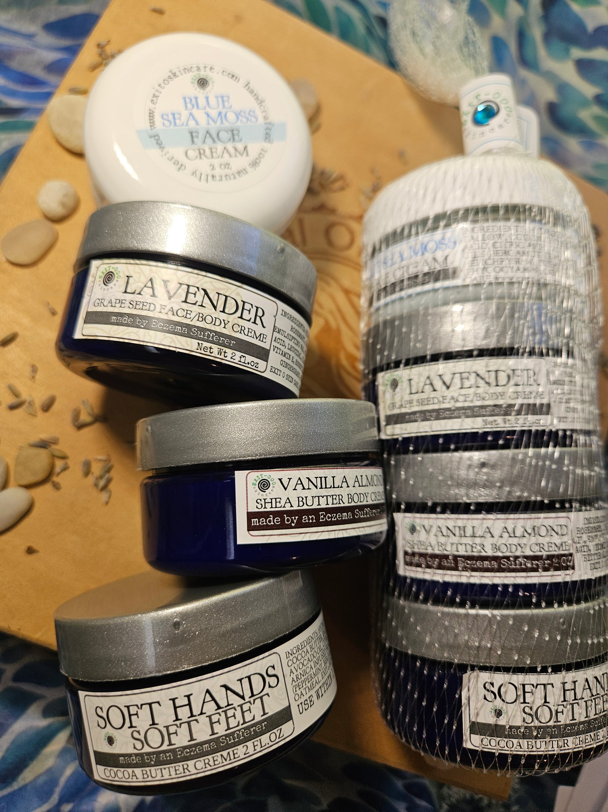 A sleeve of 4 creams (2oz each). Give a hand crafted gift to yourself, to BFF, to any life-buddy: Blue Sea Moss Face Cream 2oz, Lavender Grapeseed Cream 2oz, Vanilla Almond Shea Butter Cream 2oz, Soft Hands Soft Feet Cream 2oz. A caring, thoughtful gift that sings "Love your self and cream on!". Unisex - nothing flowery here..