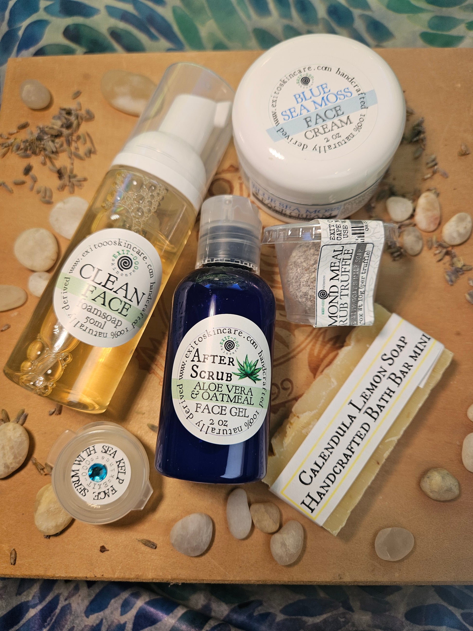 Luxurious, super functional, unique, lovingly human. Works well for all skin types (except for extremely oily skin). Give a hand crafted gift to yourself, to BFF, to any life-buddy: Blue Sea Moss Face Cream 2oz, Clean Face Foaming Face Wash 50ml, Exfoliating Almond Scrub Truffle 0.8oz, After Scrub Gel 2oz (Aloe &Oats), Calendula Lemon Bath Soap 1oz AND a bonus jeweled vial of Face Serum with Sea Kelp 5g . A caring, thoughtful gift that sings "Love your self!". Unisex.