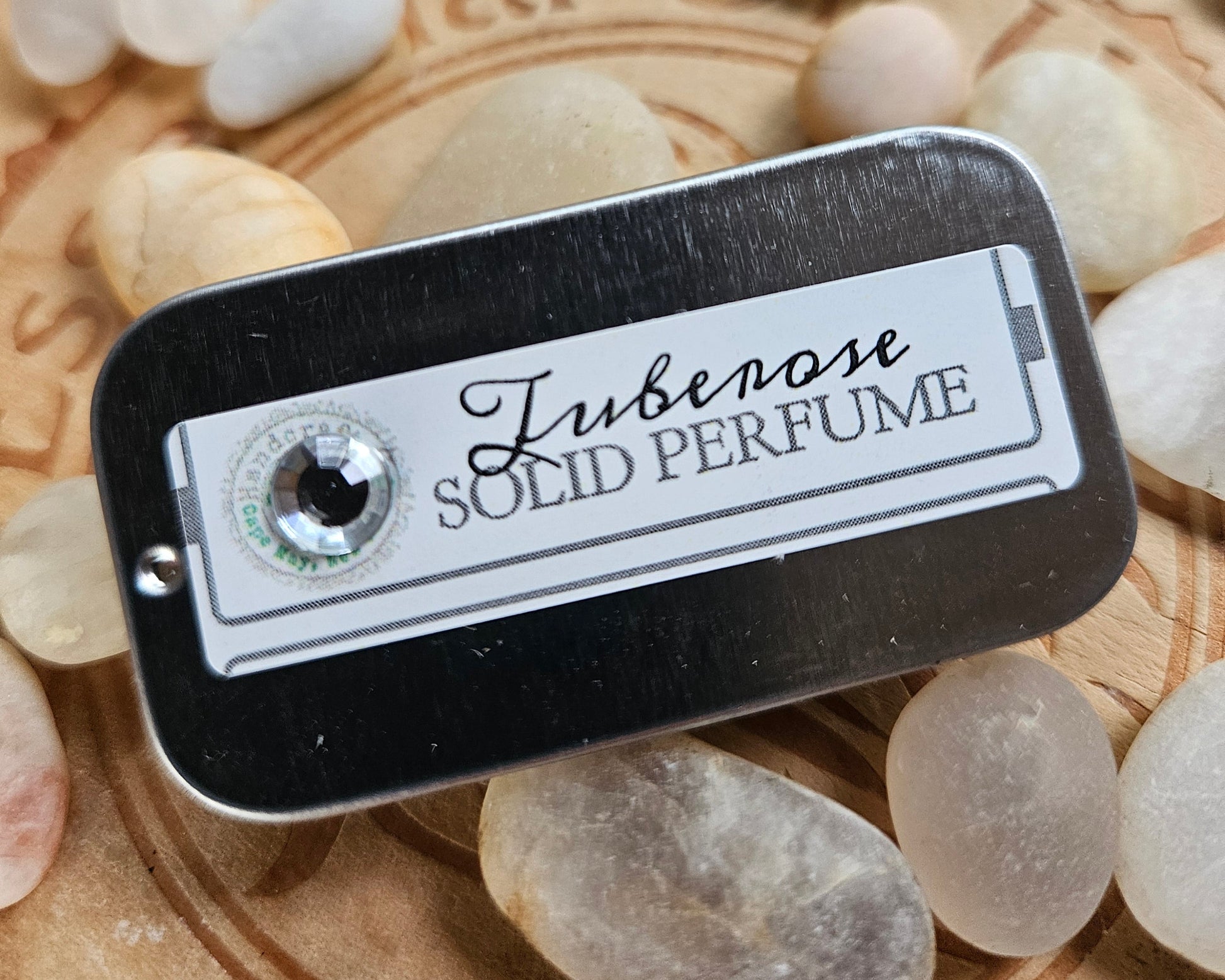 A solid perfume for self-care, not to Wow others ~ this is truly a naturally derived perfume. A portable SOLID natural perfume made from Tuberose Floral Wax, an ancient Indian technique of extracting the delicate scent of the blossom without boiling. 6 grams in a cute and handy sliding tin.