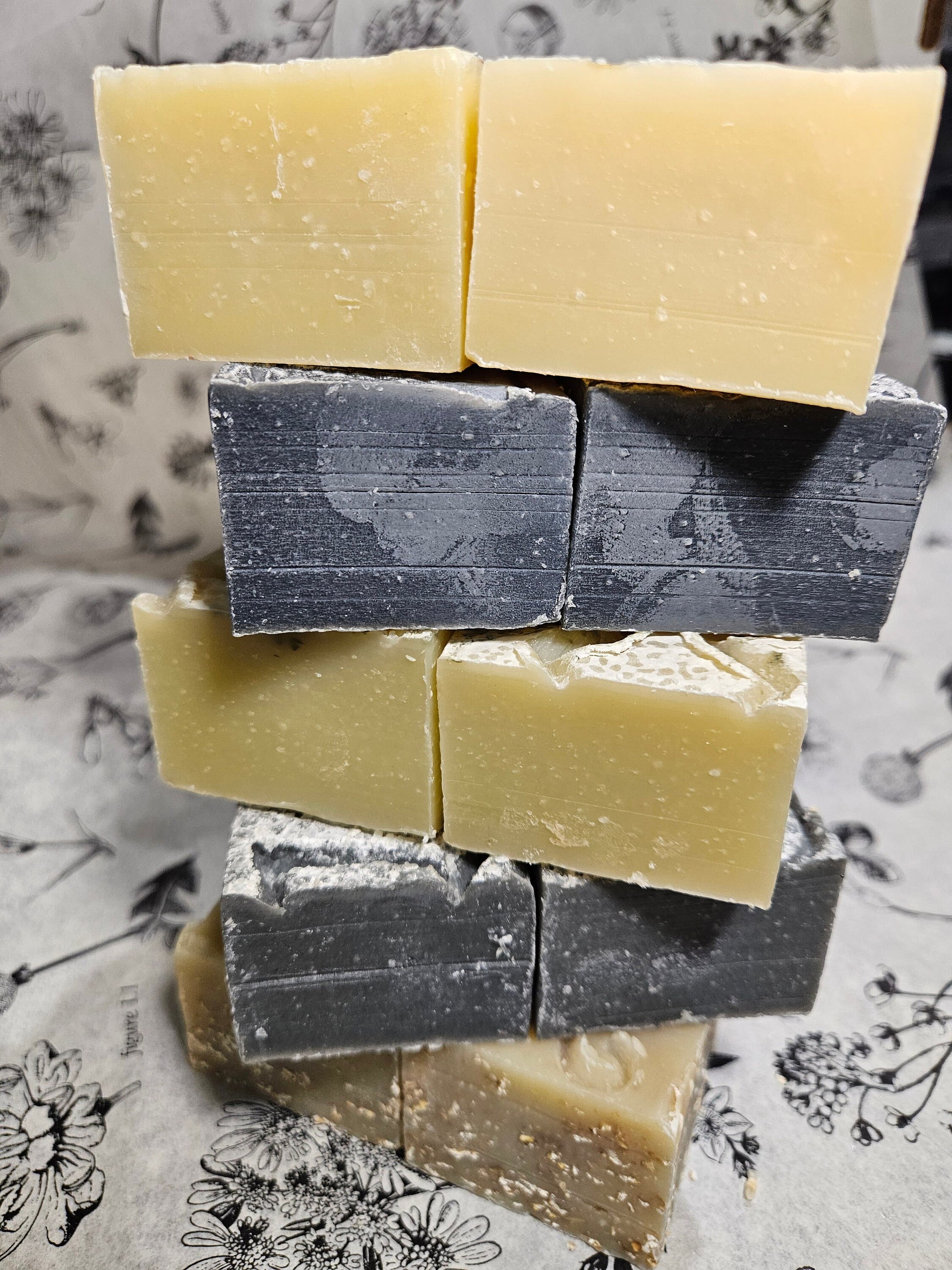 INGREDIENTS: TALLOW, DISTILLED WATER, OLIVE OIL, COCONUT OIL, SODIUM HYDROXIDE LYE, ESSENTIAL OILS (LITSEA CUBEBA, PEPPERMINT, SPEARMINT, EUCALYPTUS, AUSTRALIAN TEA TREE, BITTER ALMOND, PINK GRAPEFRUIT, GERANIUM BOURBON, WINTERGREEN), BOTANICALS (OATMEAL, ACTIVATED CHARCOAL, EUCALYPTUS LEAVES, OATMEAL) , DEAD SEA MINERAL MUD, SPIRULINA POWDER, FRENCH GREEN CLAY.