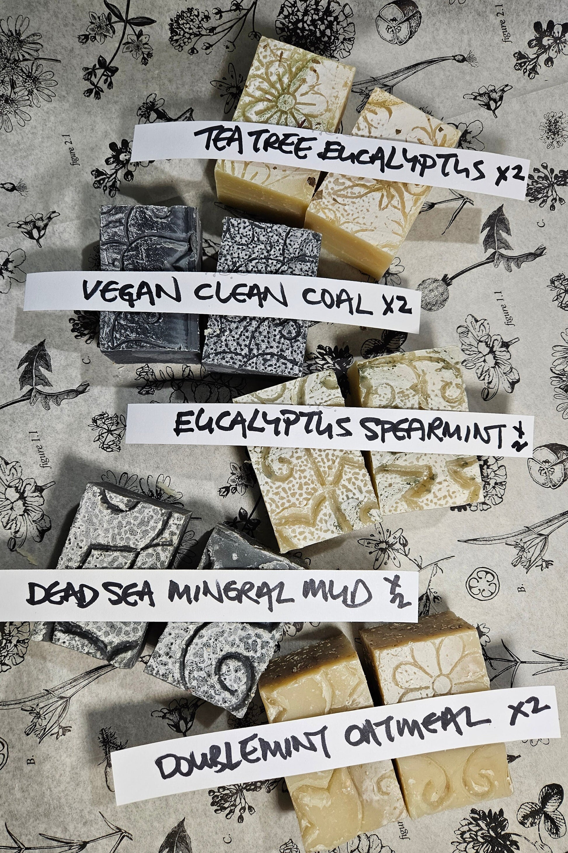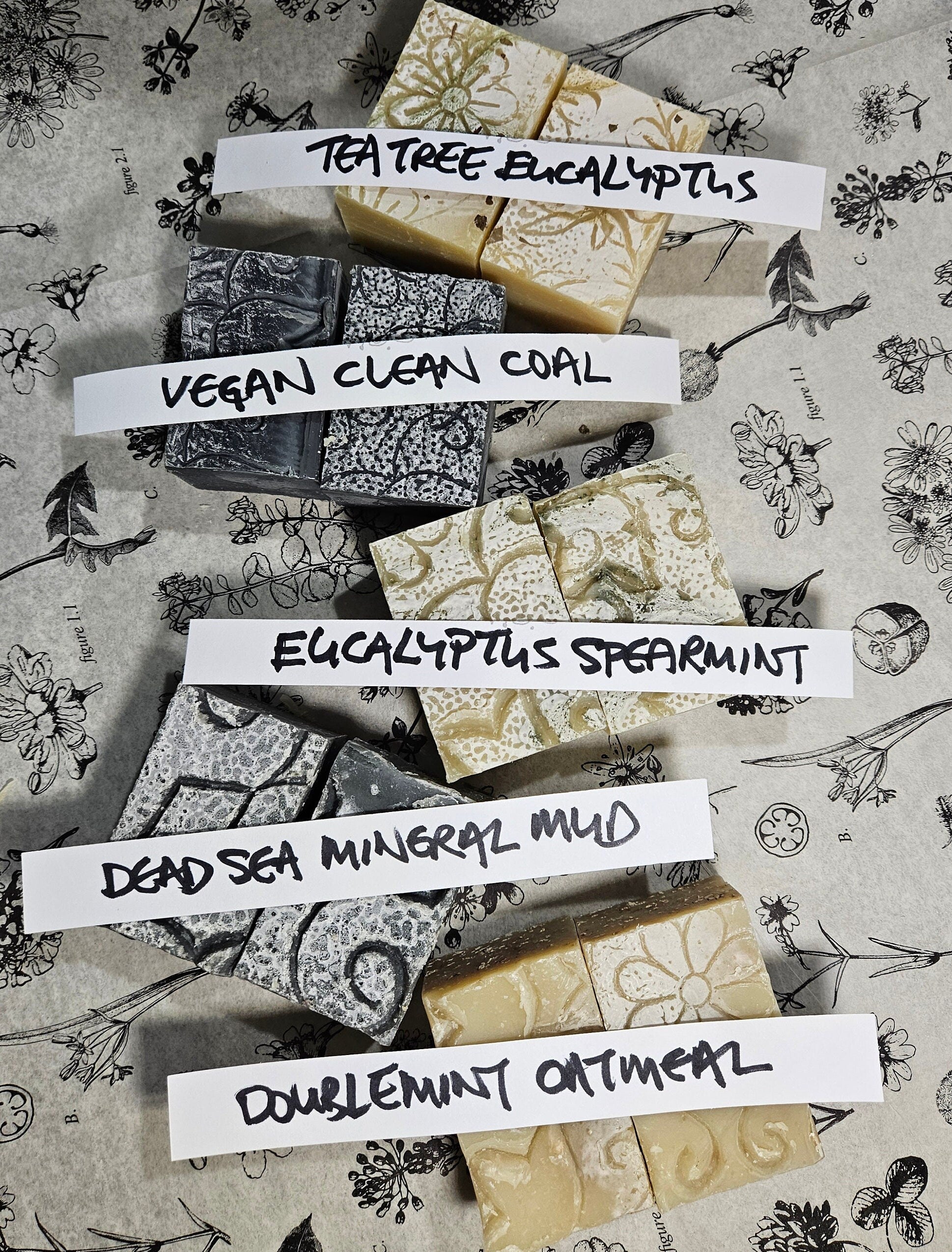 If you wish to know which bar is which, please select the individually labeled bars in the soap section "Soap Bars" (ONE EXAMPLE : https://www.etsy.com/listing/1272796419/sbar-eucalyptus-spearmint-new-b5g1).