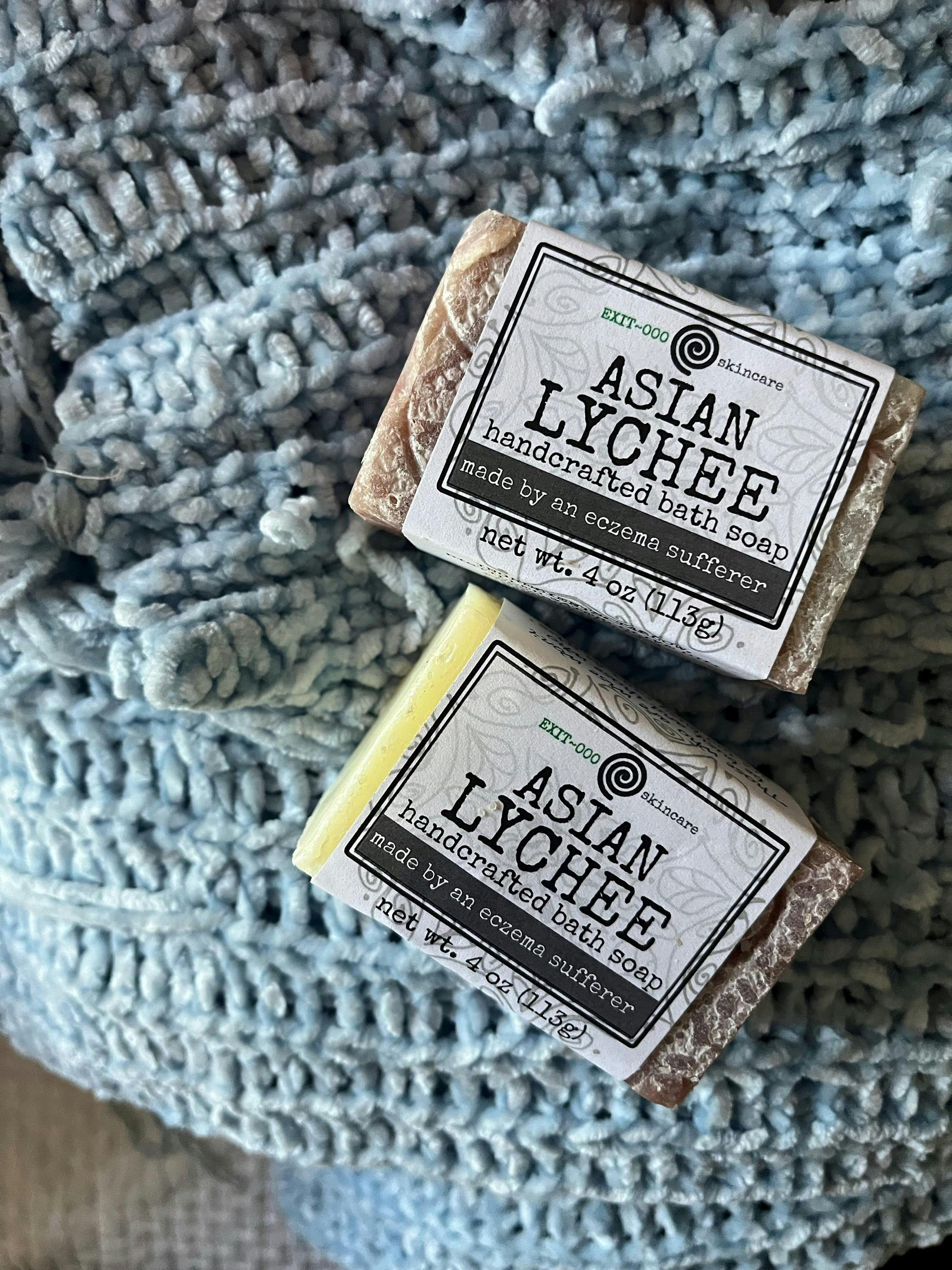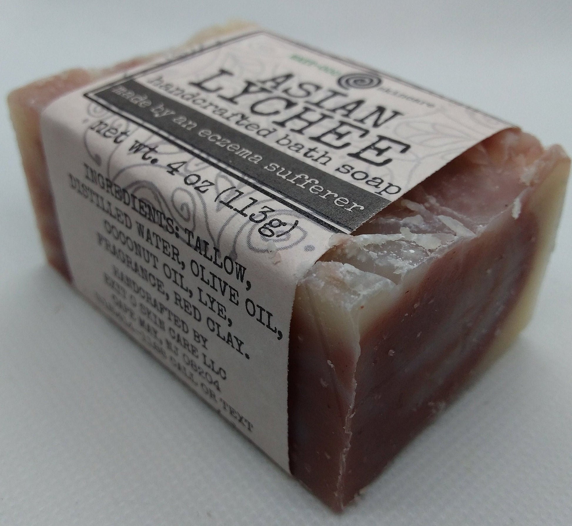 One sweet fruity Asian Lychee scented 4 oz bar of cold processed soap, labeled.