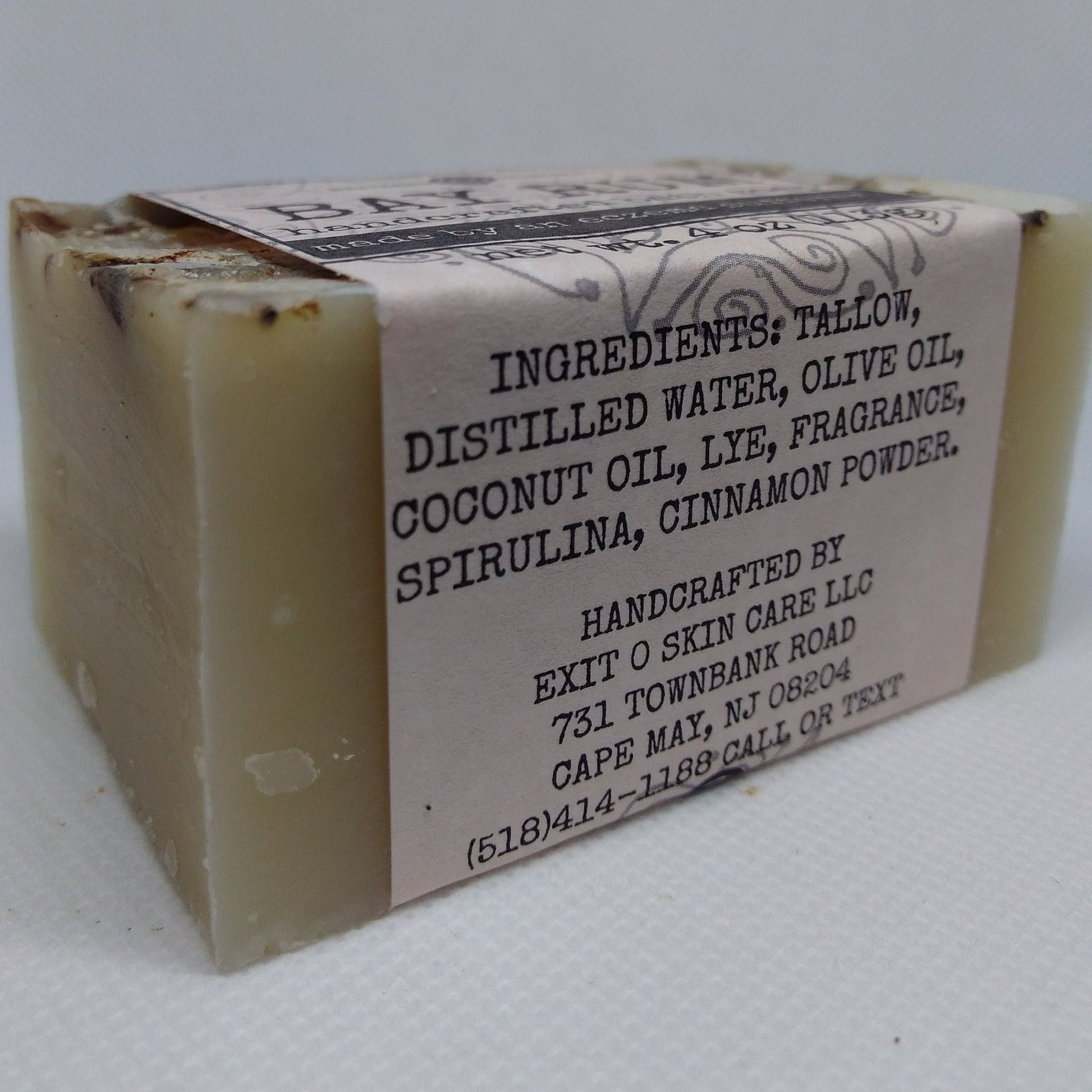 INGREDIENTS: TALLOW, DISTILLED WATER, OLIVE OIL, COCONUT OIL, LYE, FRAGRANCE, SPIRULINA, CINNAMON POWDER.