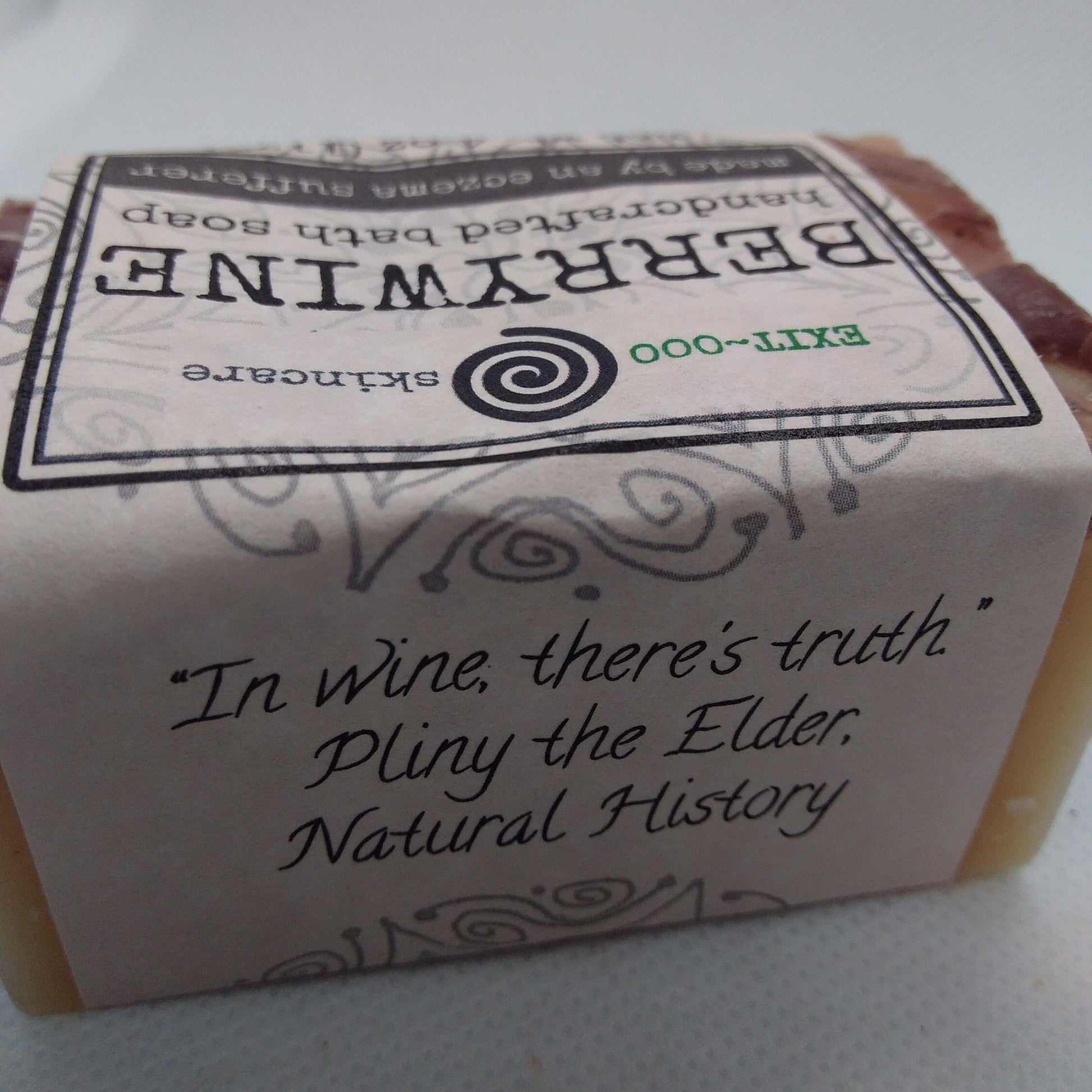 A mildly scented bar with fruity wine notes. One 4 oz bar of cold processed soap, labeled.