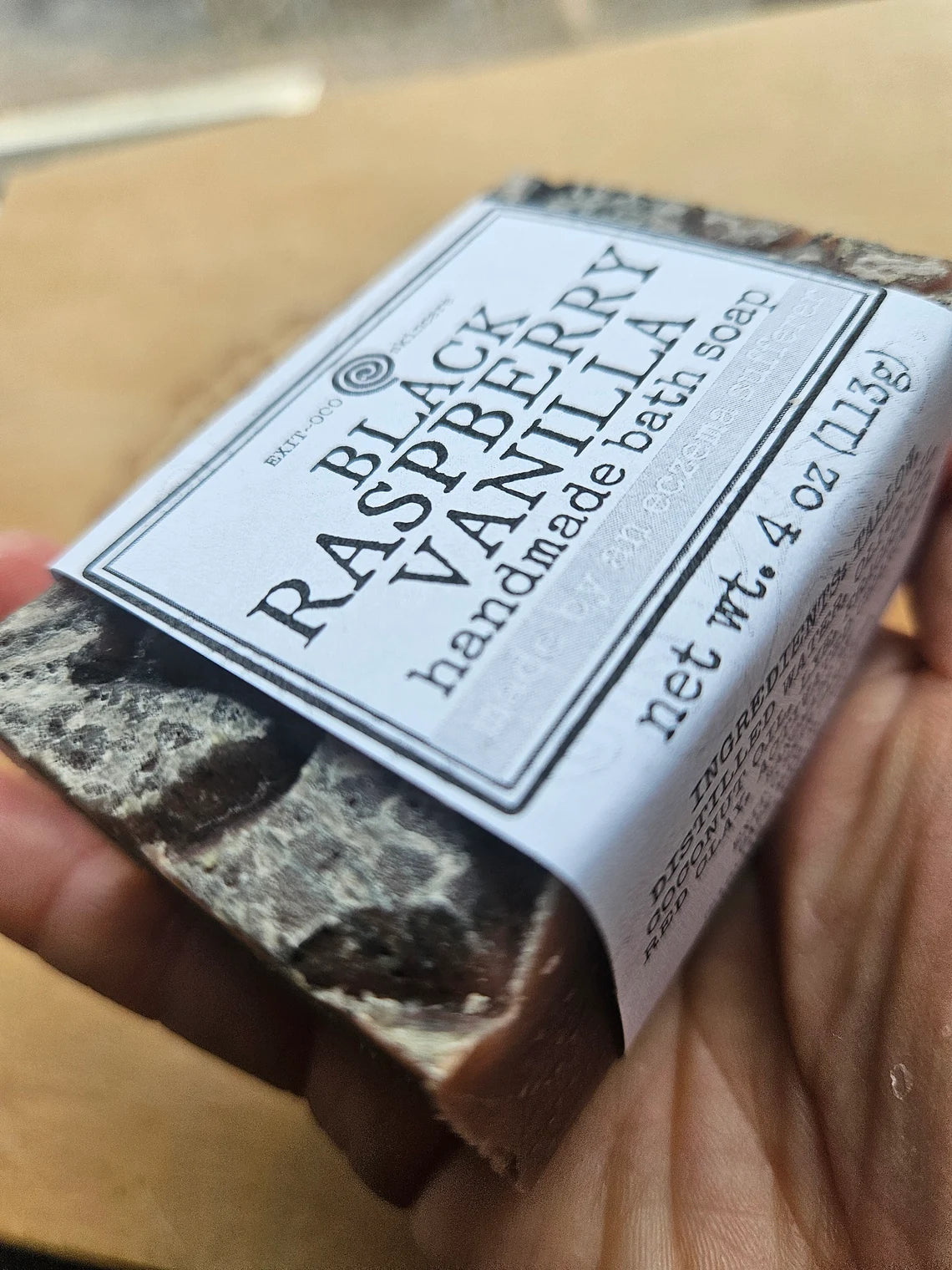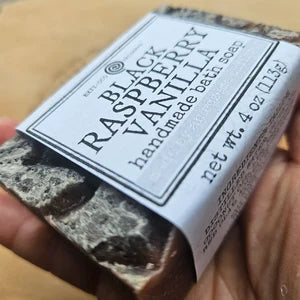 Black Raspberry Vanilla Soap is smooth, fruity, and bursting with all the goodness of ripe berries and creamy velvety vanilla. One 4 oz bar of cold processed soap, labeled.