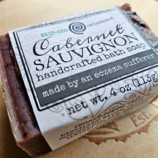 Classic red wine notes, Cabernet Sauvignon scented bar. One 4 oz bar of cold processed soap, labeled.