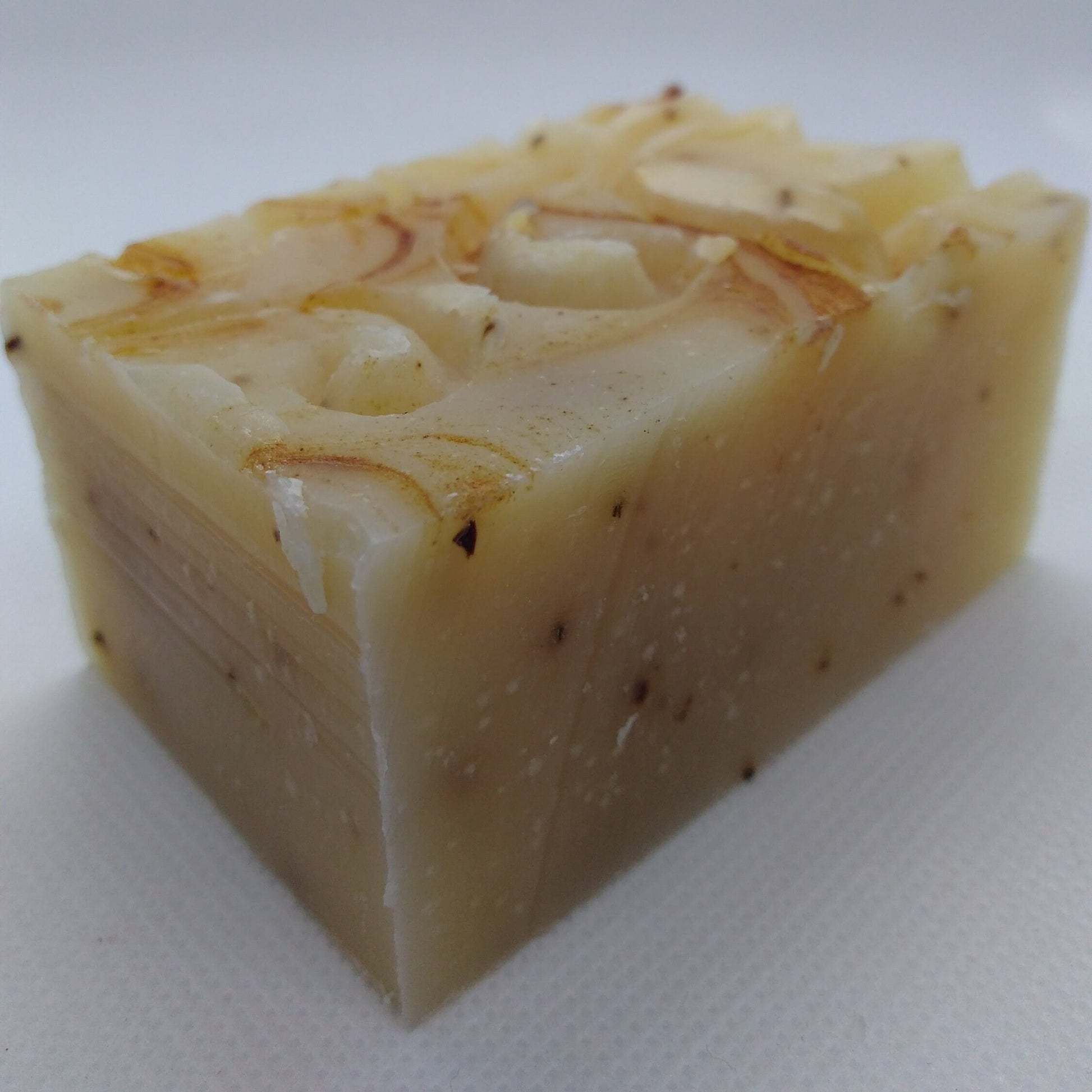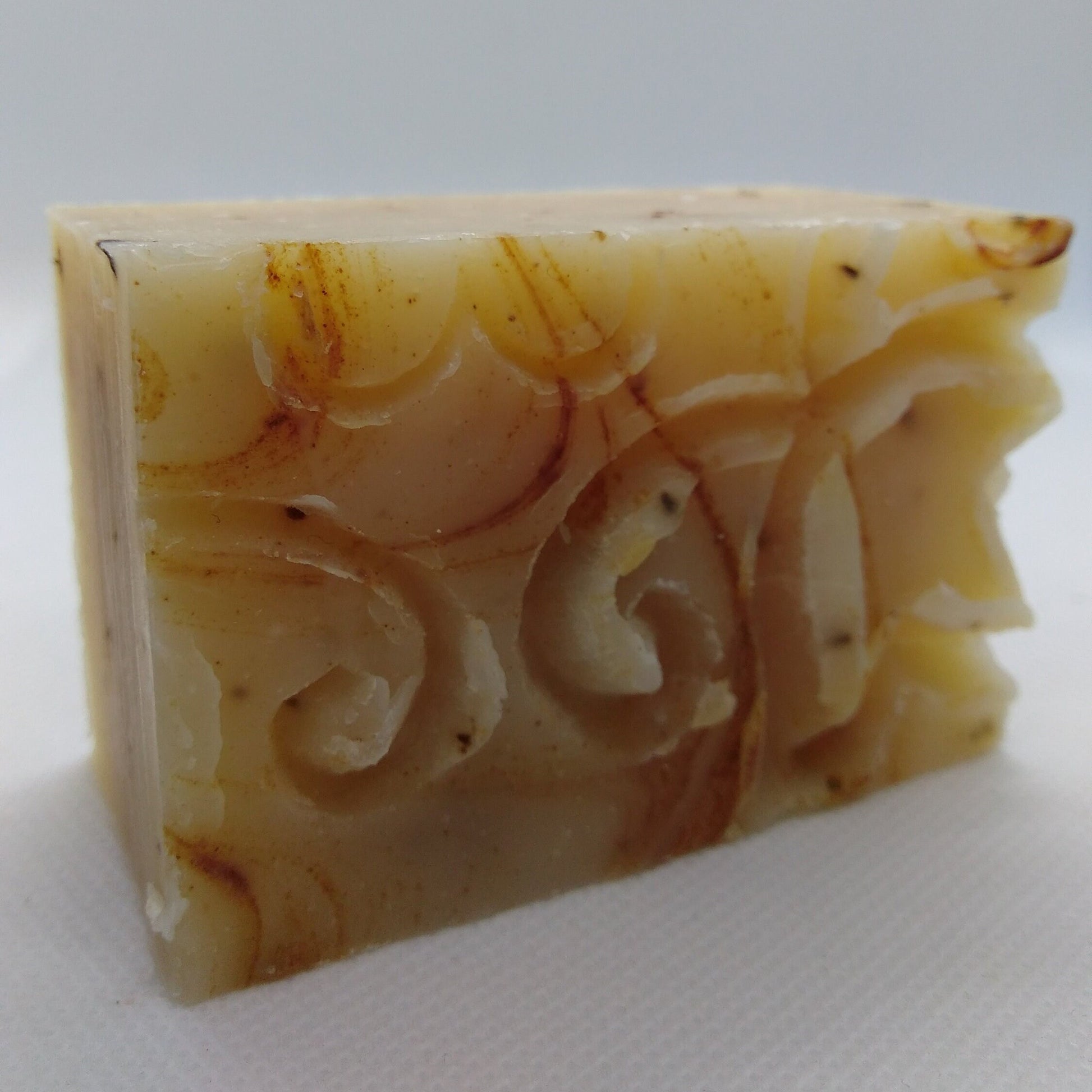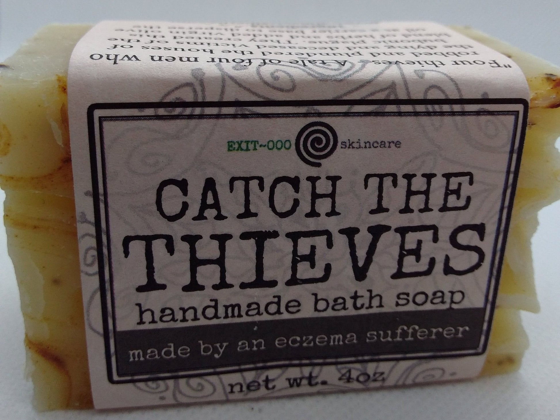 My version of "Thieves Oil" blend of herbs with a historical background (google "Four Thieves"). Lemony bar rounded with rosemary, fresh eucalyptus and spicy notes. One 4 oz bar of cold processed soap, labeled.