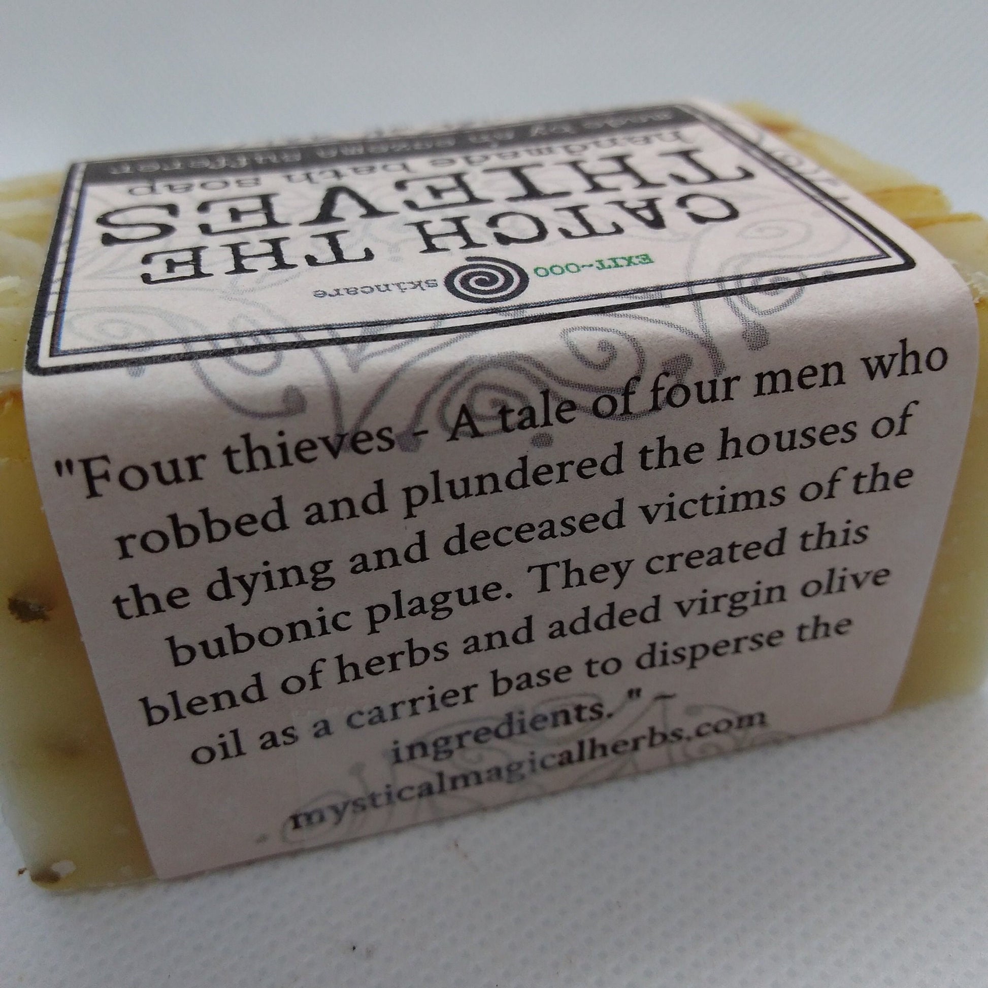 "Four thieves - A tale of four men who robbed and plundered the houses of the dying and deceased victims of the bubonic plague. They created this blend of herbs and added virgin olive oil as a carrier base to disperse the ingredients. " ~ mysticalmagicalherbs.com