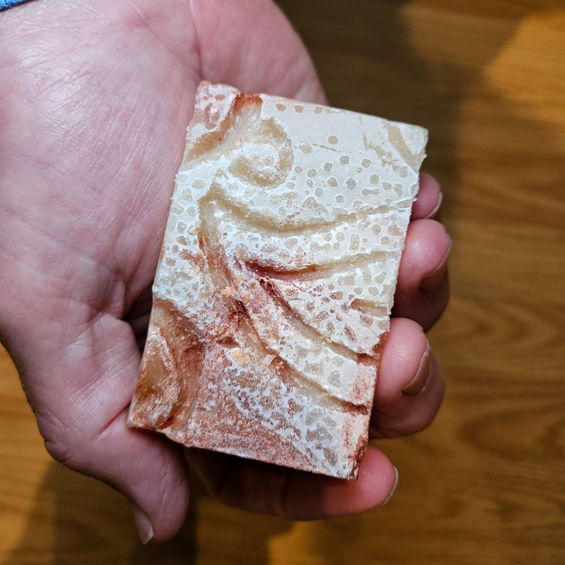 INGREDIENTS: TALLOW, DISTILLED WATER, OLIVE OIL, COCONUT OIL, LYE, FRAGRANCE, HIMALAYAN CEDARWOOD ESSENTIAL OIL, MADDER ROOT POWDER.