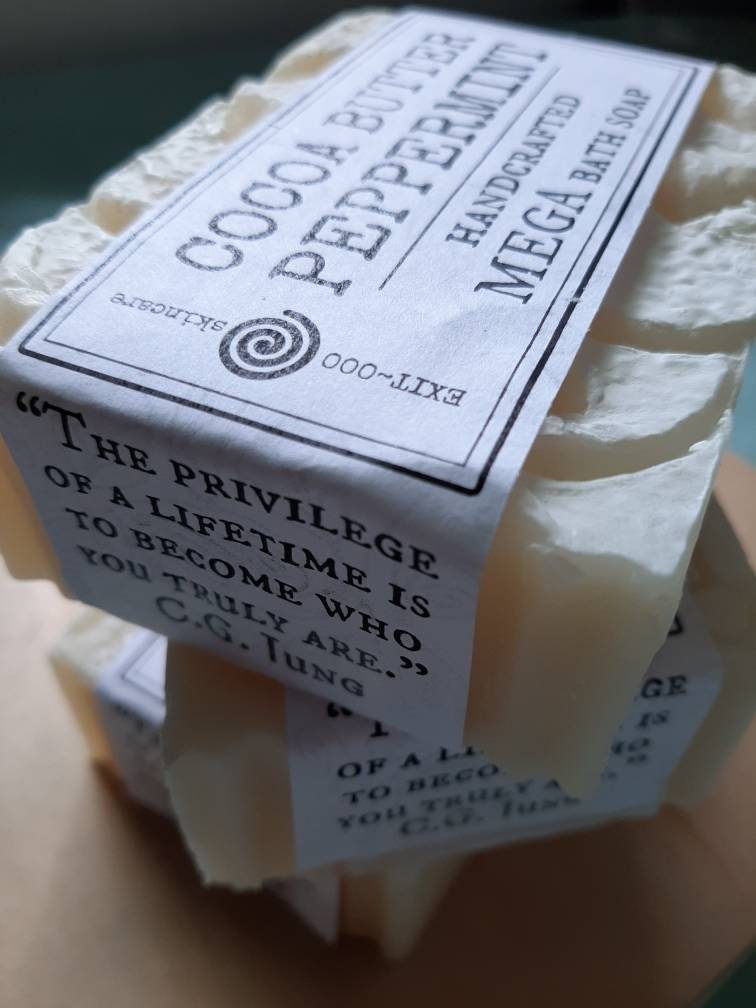 Minty cool bar super-fatted with cocoa butter. MEGA sized (double of the usual $5.99 bar) ~ approx 8.5 -9.5 oz bar of cold processed soap, hand-cut & labeled.