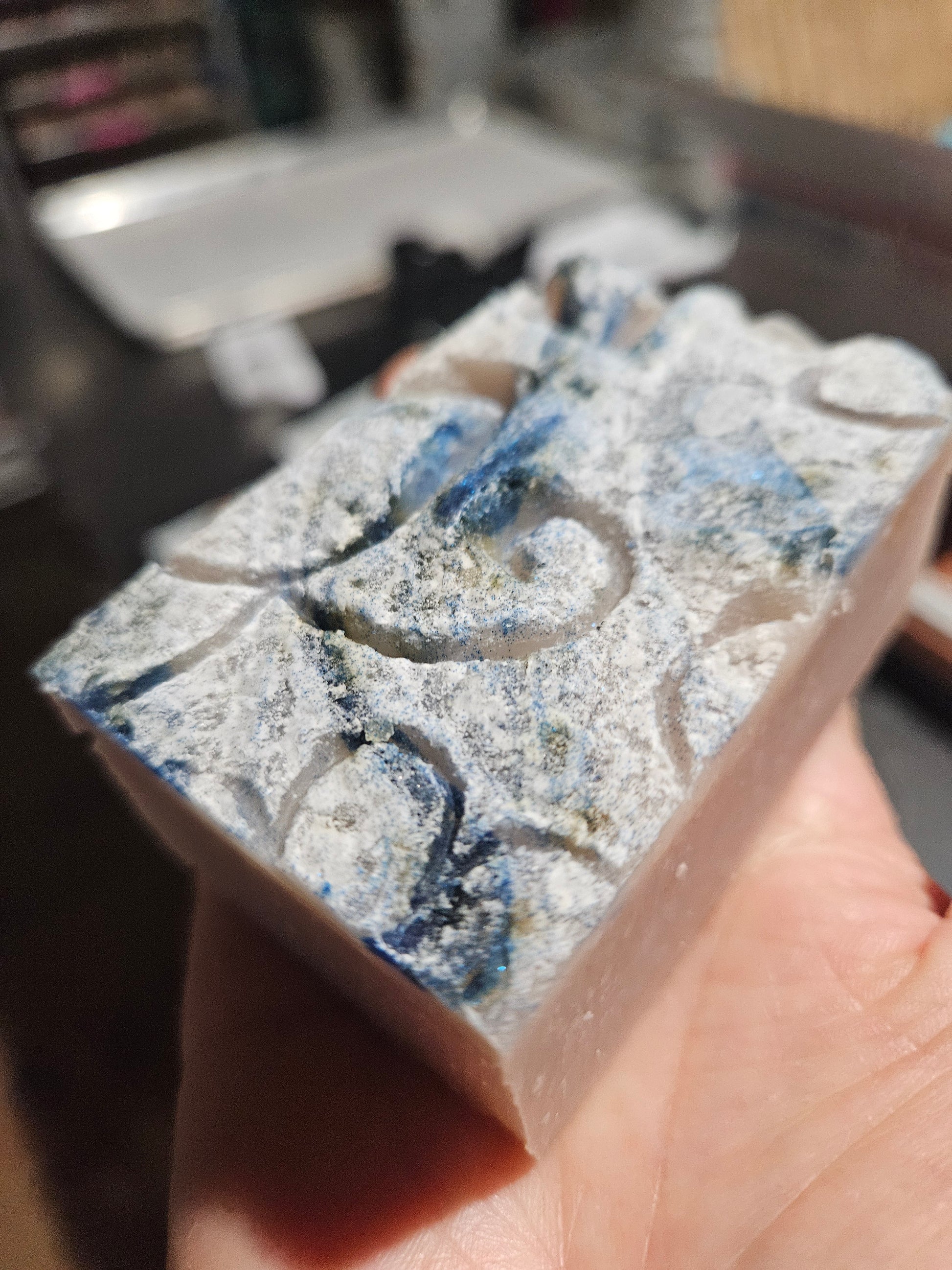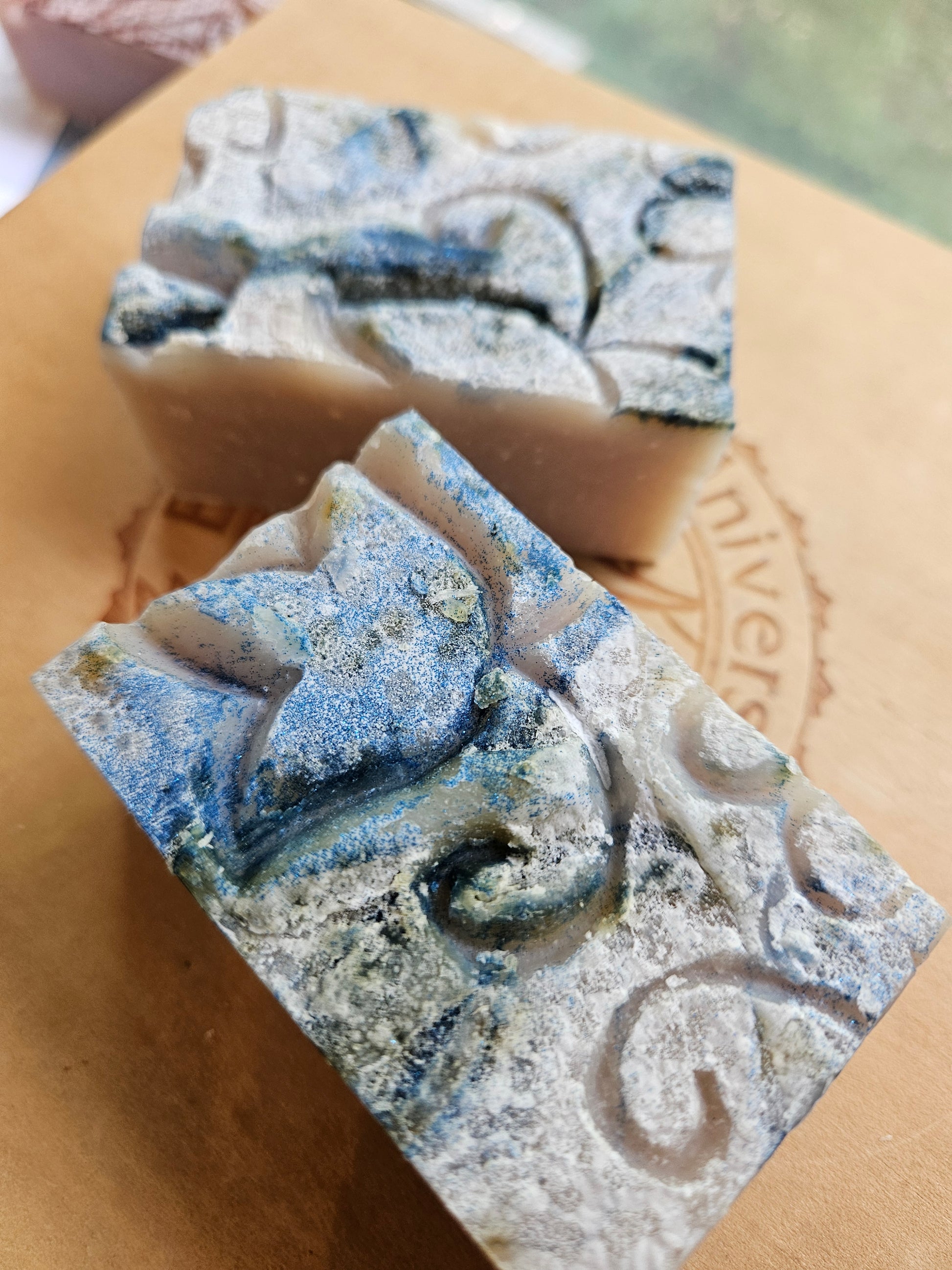 INGREDIENTS: WARRINGTON FARMS USA TALLOW, WATER, OLIVE OIL, COCONUT OIL, LYE, FRAGRANCE (OCEAN BREEZE, BLACK SEA), GREEN CLAY, BLUE MICA.