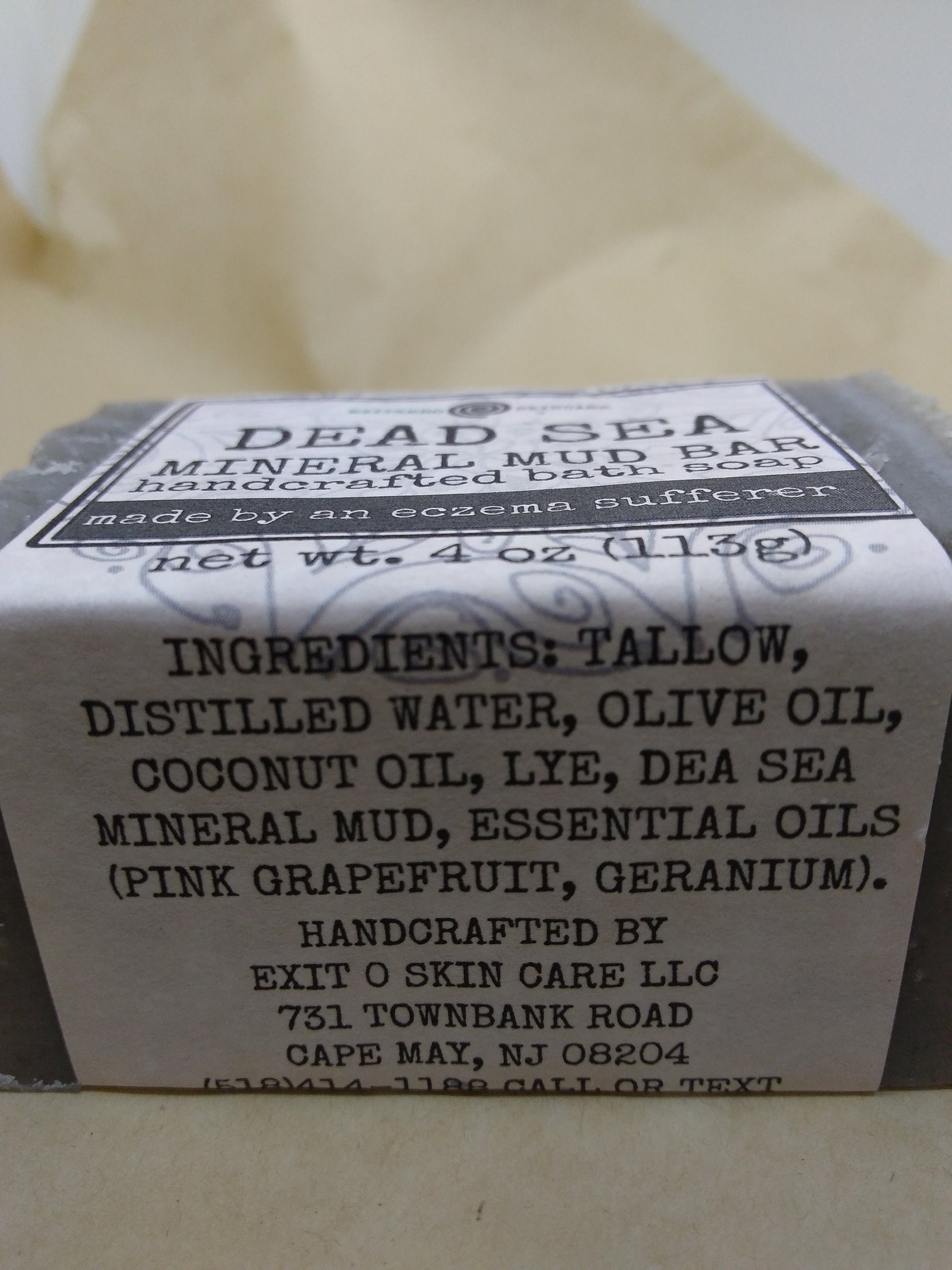 INGREDIENTS: TALLOW, DISTILLED WATER, OLIVE OIL, COCONUT OIL, LYE, DEAD SEA MINERAL MUD, ESSENTIAL OILS (PINK GRAPEFRUIT, GERANIUM).