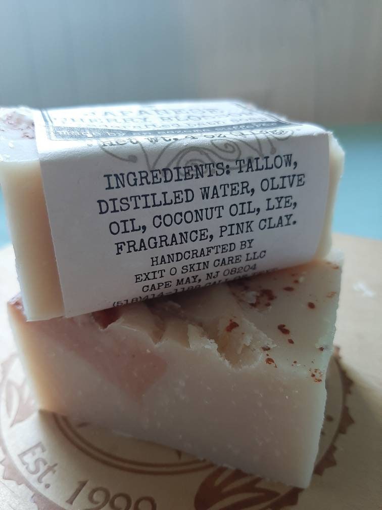 INGREDIENTS: TALLOW, DISTILLED WATER, OLIVE OIL, COCONUT OIL, LYE, FRAGRANCE, PINK CLAY.