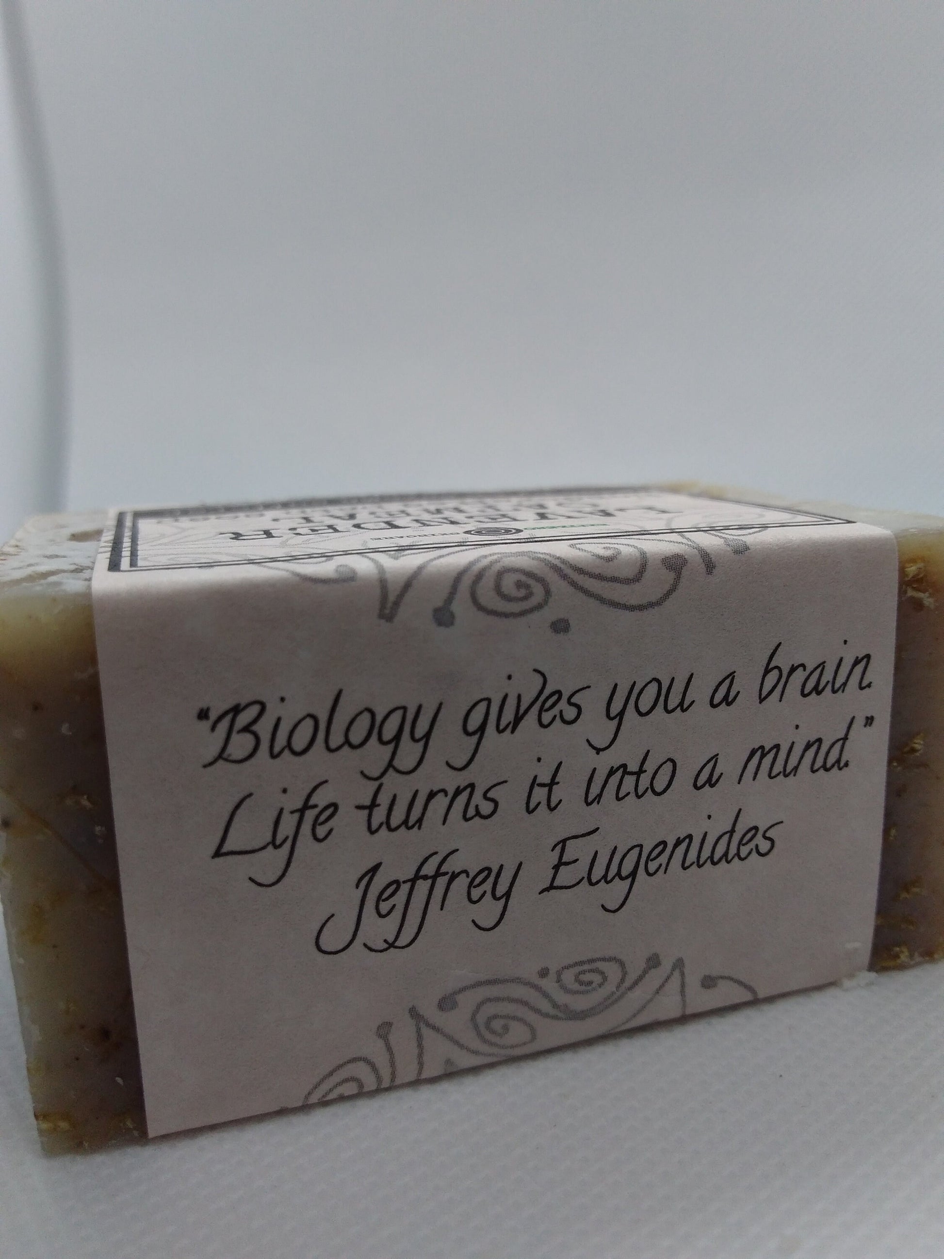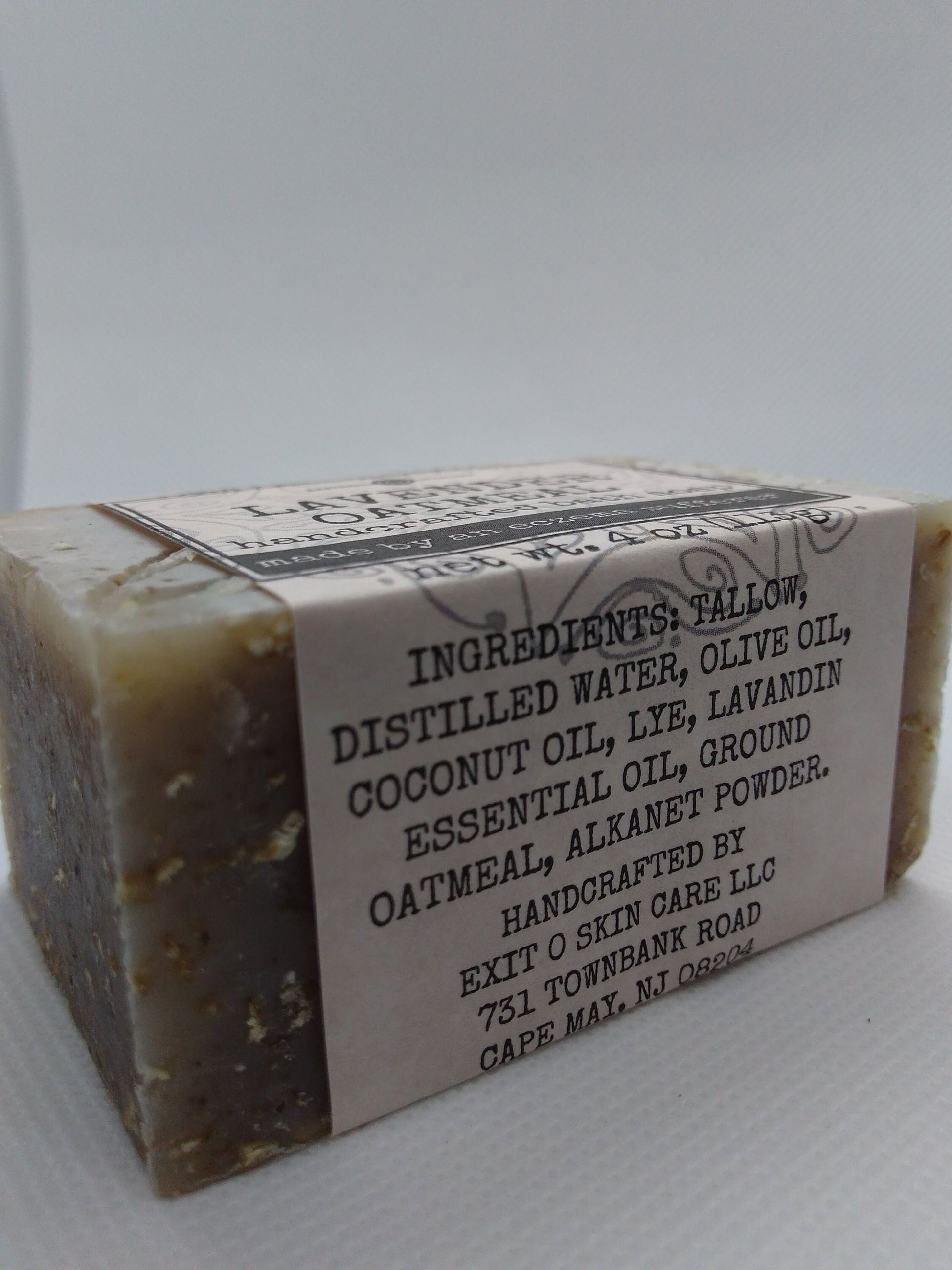 Lavender bar with gently exfoliating oatmeal. One 4 oz bar of cold processed soap, labeled.