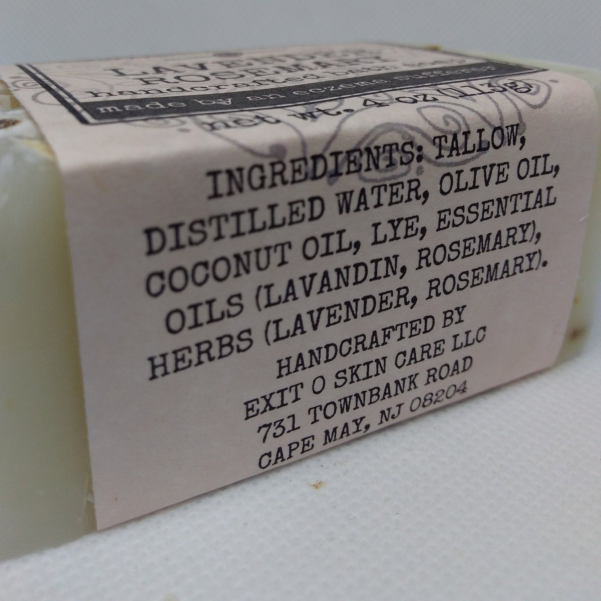 INGREDIENTS: TALLOW, DISTILLED WATER, OLIVE OIL, COCONUT OIL, LYE, ESSENTIAL OILS (LAVANDIN, ROSEMARY), ROSEMARY LEAVES, ALKANET POWDER.