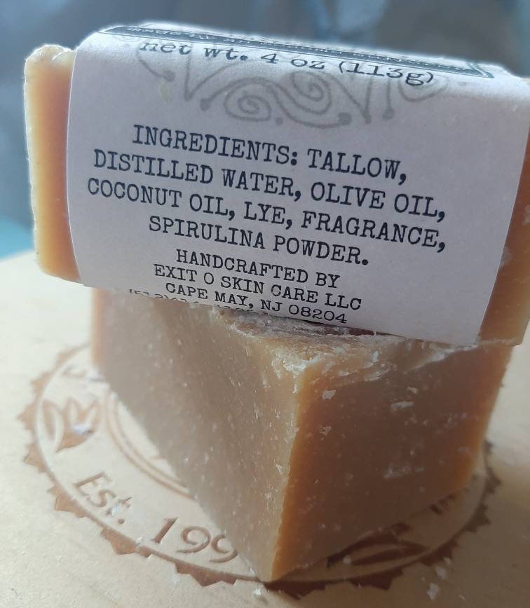 INGREDIENTS: TALLOW, DISTILLED WATER, OLIVE OIL, COCONUT OIL, LYE, FRAGRANCE, SPIRULINA POWDER.