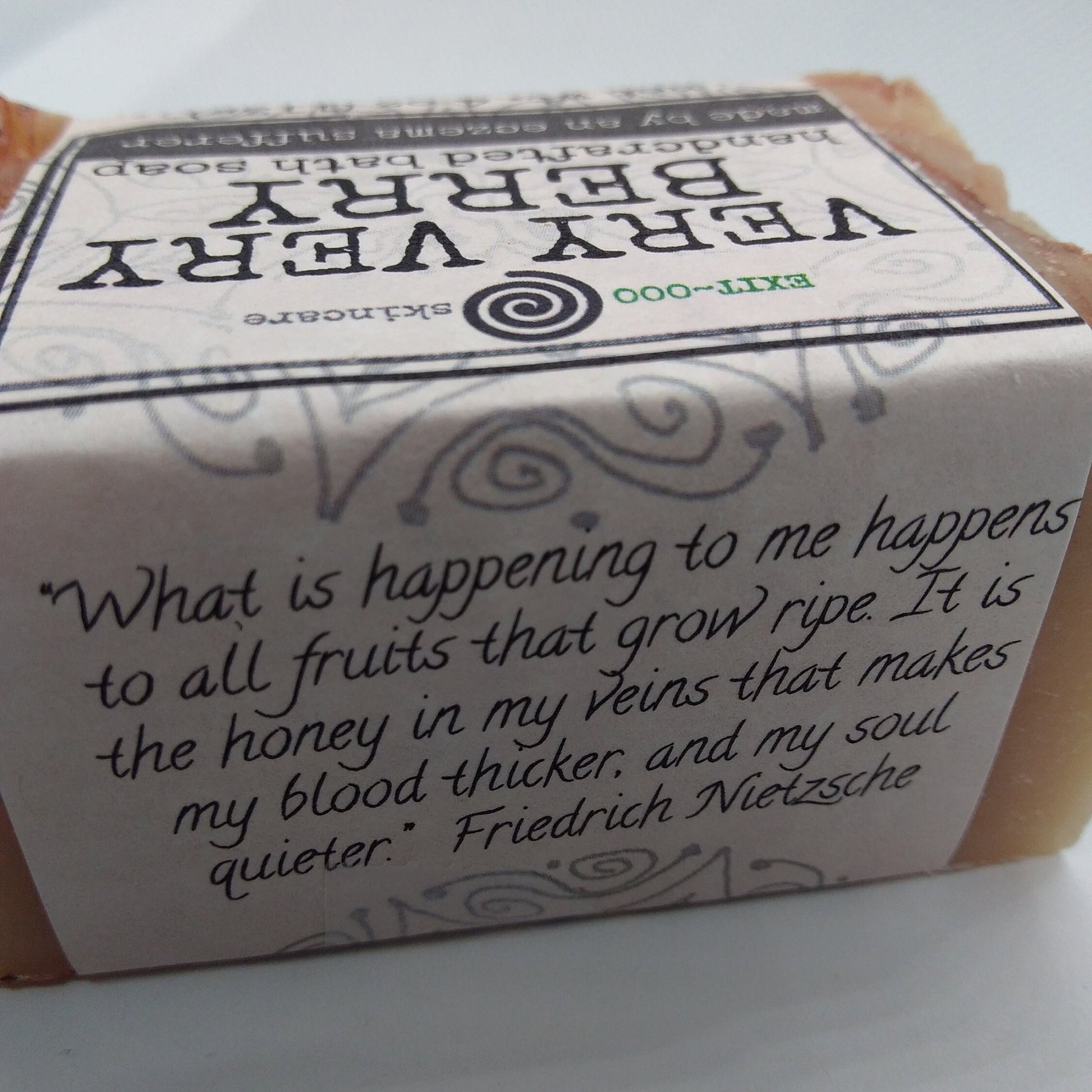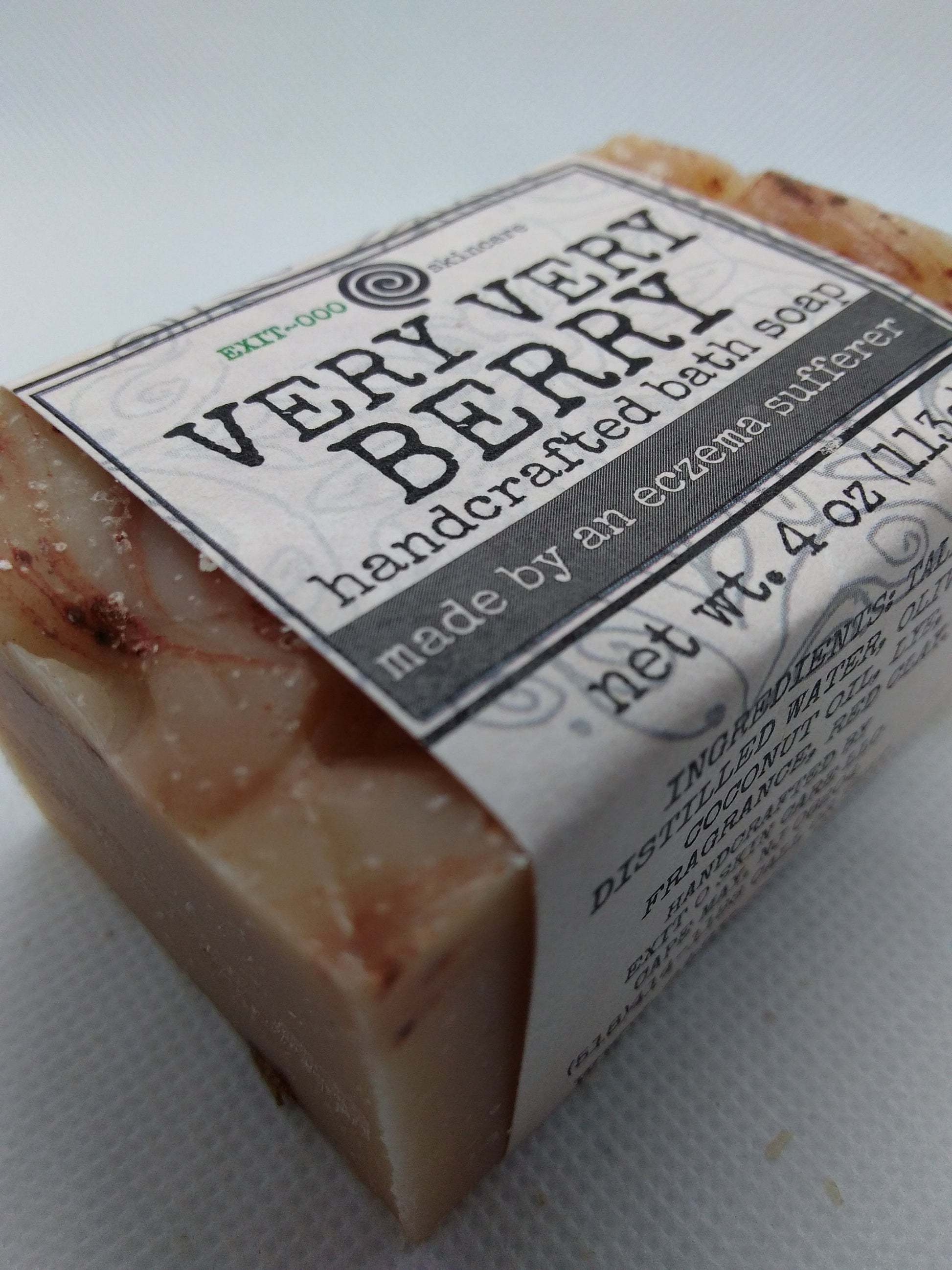 A fun berry bar with tart notes. Fresh and fruity. One 4 oz bar of cold processed soap, labeled.