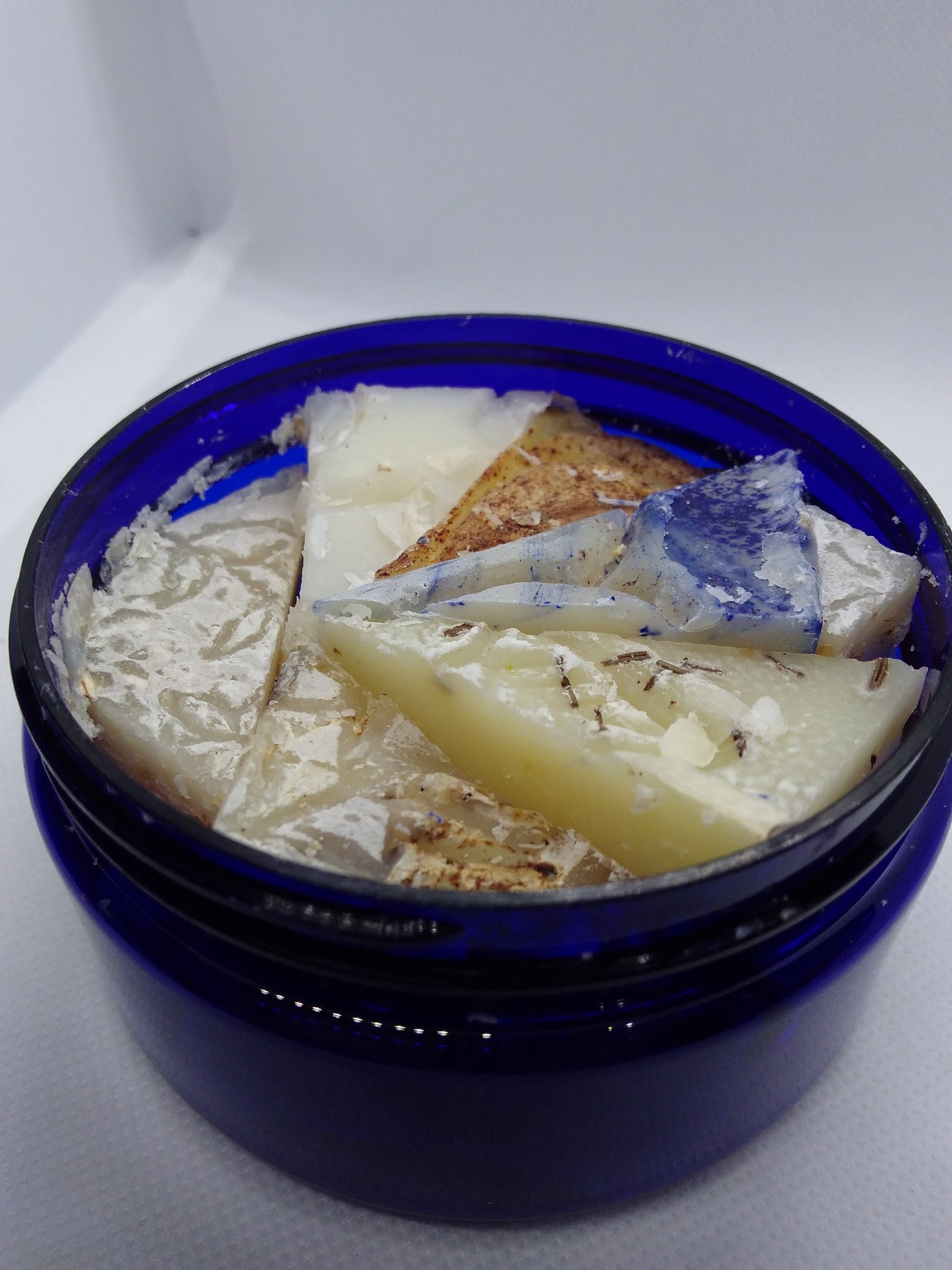 MOSAIC OF 6 SOAP WEDGES: THIEVES, BAY RUM, COCOA BUTTER PEPPERMINT, ALMOND OATMEAL, ROSEMARY LEMONGRASS, BLUE SPRUCE.