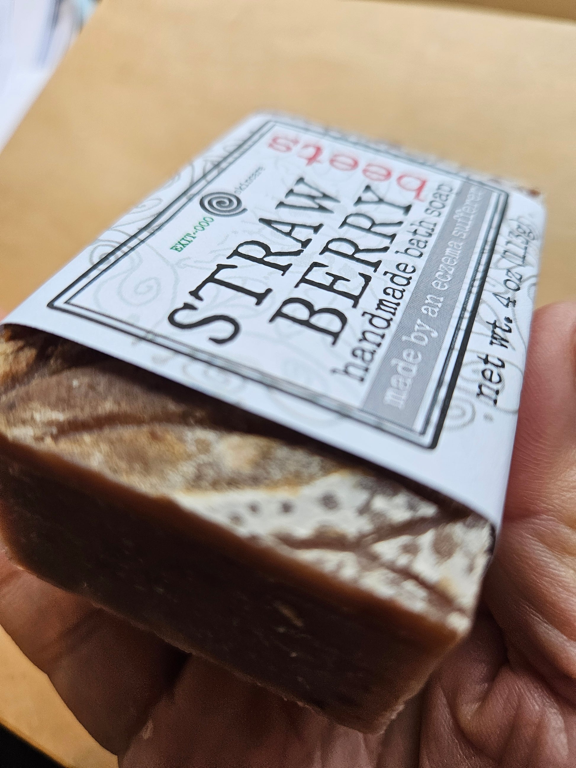 Strawberry Beet is fruity, light and fresh without the tartness. Not a strongly or sweetly scented soap. One 4 oz bar of cold processed soap, labeled.
